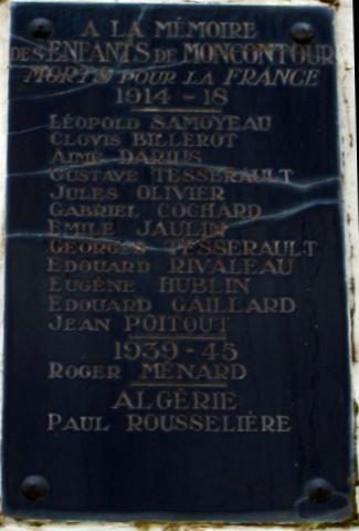 Cette stèle a été érigée à la mémoire des deux héros : le Lieutenant Naud Daniel et le Cavalier Guibert Eugène tombés au Combat de Moncontour le 22 juin 1940. |